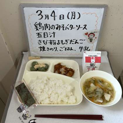 今日の給食の献立は、『鶏肉のみそバターソース、五目汁、きな粉よもぎだんご、焼きのり、ごはん、牛乳』でした。