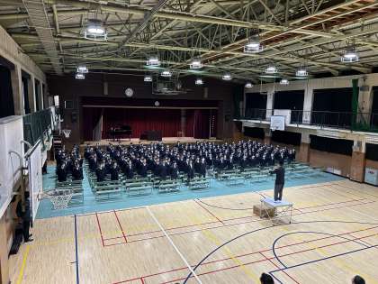 本日の5.6限では、座礼立礼の練習、実際に名前を読み上げて一連の流れを確認、そして全体合唱の練習を行いました。