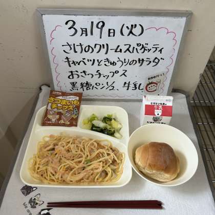 今日の給食の献立は『さけのクリームスパゲッティ、キャベツときゅうりのサラダ、おさつチップス、黒糖パン1/2、牛乳』でした。