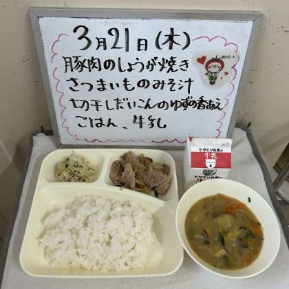 献立は、『豚肉のしょうが焼き、さつまいものみそ汁、切干しだいこんのゆずの香あえ、ごはん、牛乳』でした。