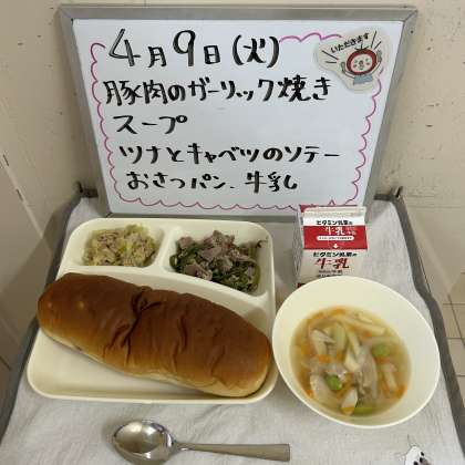 『豚肉のガーリック焼き、スープ、ツナとキャベツのソテー、おさつパン、牛乳』でした。