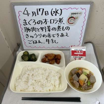 今日の給食の献立は、『まぐろのオーロラ煮、豚肉と野菜の煮もの、きゅうりの赤じそあえ、ごはん、牛乳』でした。