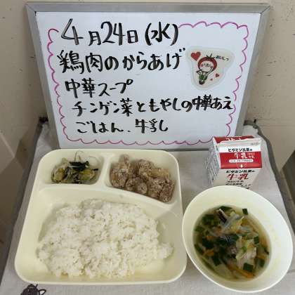 今日の給食の献立は、『鶏肉のからあげ、中華スープ、チンゲン菜ともやしの中華あえ、ごはん、牛乳』でした。