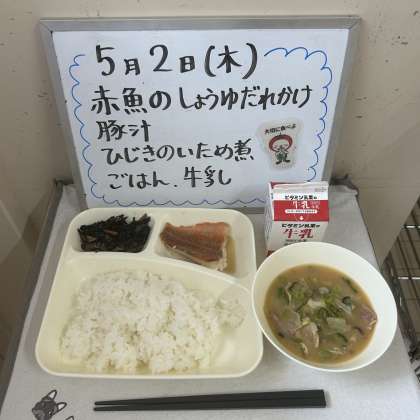 今日の給食の献立は、『赤魚のしょうゆだれかけ、豚汁、ひじきのいため煮、ごはん、牛乳』でした。