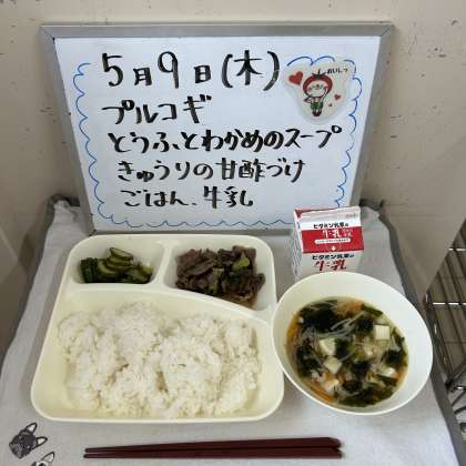 今日の給食の献立は、『プルコギ、とうふとわかめのスープ、きゅうりの甘酢づけ、ごはん、牛乳』でした。