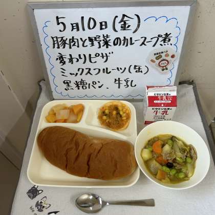 今日の給食の献立は、『豚肉と野菜のカレースープ煮、変わりピザ、ミックスフルーツ(缶)、黒糖パン、牛乳』でした。