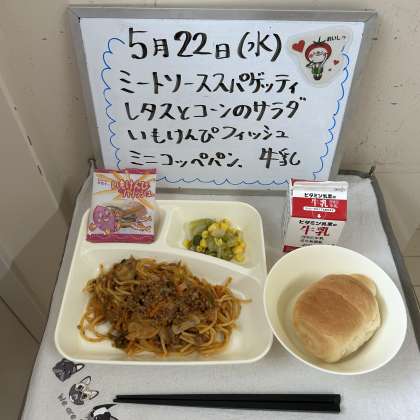 今日の給食の献立は、『ミートソーススパゲッティ、レタスとコーンのサラダ、いもけんぴフィッシュ、ミニコッペパン、牛乳』でした。