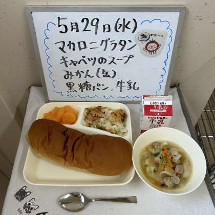 今日の給食の献立は、『マカロニグラタン、キャベツのスープ、みかん(缶)、黒糖ぱん、牛乳』でした。