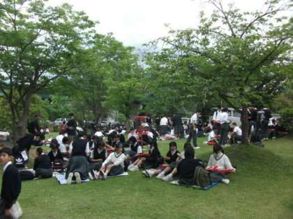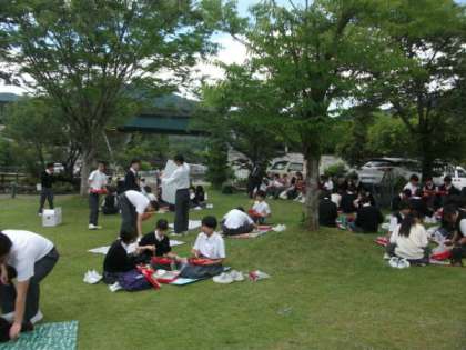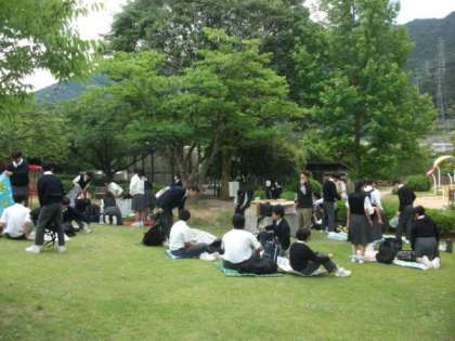 クラスごとに分かれて、レジャーシートを敷いて、昼食のお弁当を食べました。