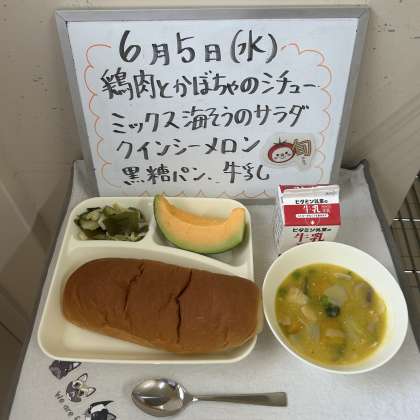 今日の給食の献立は、『鶏肉とかぼちゃのシチュー、ミックス海そうのサラダ、クインシーメロン、黒糖パン、牛乳』でした。