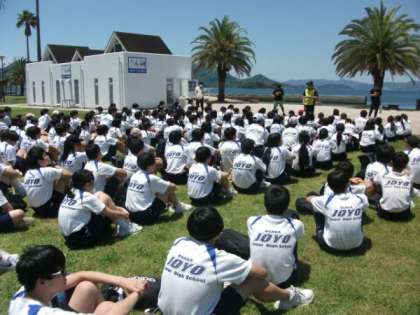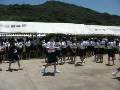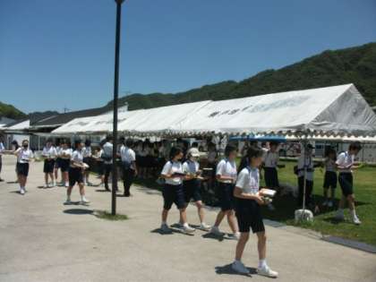 山本先生からの諸注意の後、砂浜で学年全体写真を撮ってから、昼食のお弁当を受け取ります。