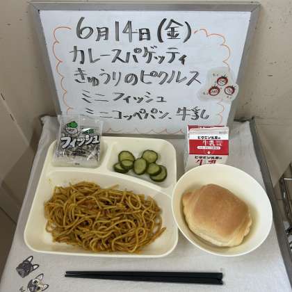 今日の給食の献立は、『カレースパゲッティ、きゅうりのピクルス、ミニフィッシュ、ミニコッペパン、牛乳』でした。