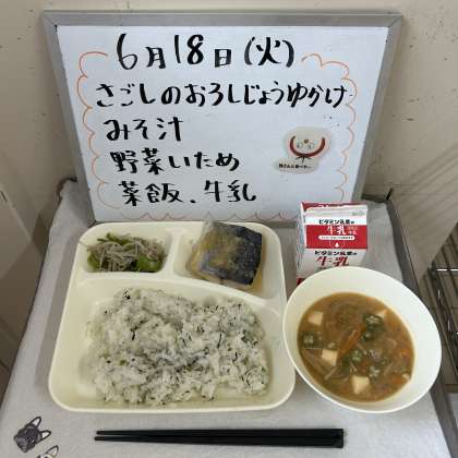今日の給食の献立は、『さごしのおろしじょうゆかけ、みそ汁、野菜いため、菜飯、牛乳』でした。