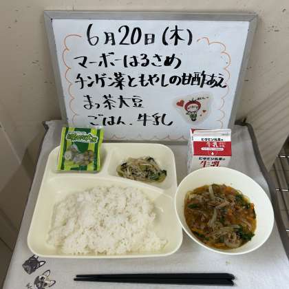 今日の給食の献立は、『マーボーはるさめ、チンゲン菜ともやしの甘酢あえ、まっ茶大豆、ごはん、牛乳』でした。