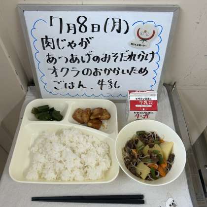 今日の給食の献立は、『肉じゃか、あつあげのみそだれかけ、オクラのおかかいため、ごはん、牛乳』でした。