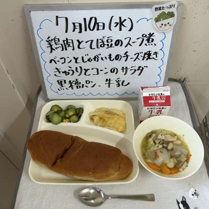今日の給食の献立は、『鶏肉とてぼ豆のスープ煮、ベーコンとじゃがいものチーズ焼き、きゅうりとコーンのサラダ、黒糖パン、牛乳』でした。