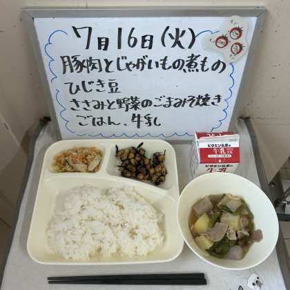 今日の給食の献立は、『豚肉とじゃがいもの煮もの、ひじき豆、ささみと野菜のごまみそ焼き、ごはん、牛乳』でした。