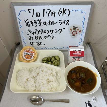 今日の給食の献立は、『夏野菜のカレーライス、きゅうりのサラダ、みかんゼリー、牛乳』でした。