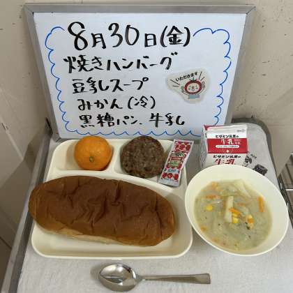 今日の給食の献立は、『焼きハンバーグ、豆乳スープ、みかん(冷)、黒糖パン、牛乳』でした。
