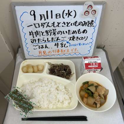 今日の給食は、月見の行事献立で『一口がんもとさといものみそ煮、牛肉と野菜のいためもの、みたらしだんご、焼きのり、ごはん、牛乳』でした。