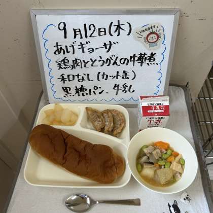 今日の給食の献立は、『あげギョーザ、鶏肉ととうがんの中華煮、和なし(カット缶)、黒糖パン、牛乳』でした。
