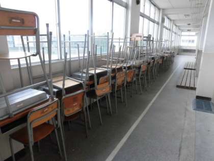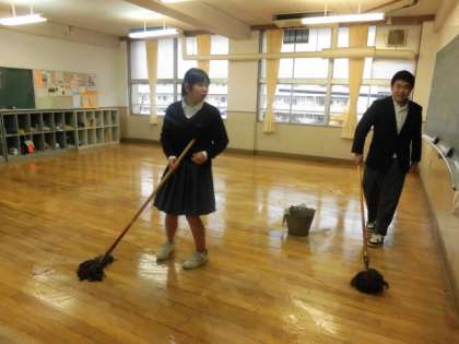 4日(金)放課後、教室の油引きです。教室内の机・椅子を廊下に出し、掃除した後、油引きを行いました。油引きの理由は、床の保護と土ぼこりが上がらないようにするためです。より良い学習環境をめざしています。