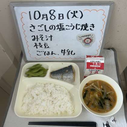 今日の給食の献立は、『さごしの塩こうじ焼き、みそ汁、枝豆、ごはん、牛乳』でした。