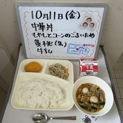 今日の給食の献立は、『中華丼、もやしとコーンのごまいため、黄桃(缶)、牛乳』でした。