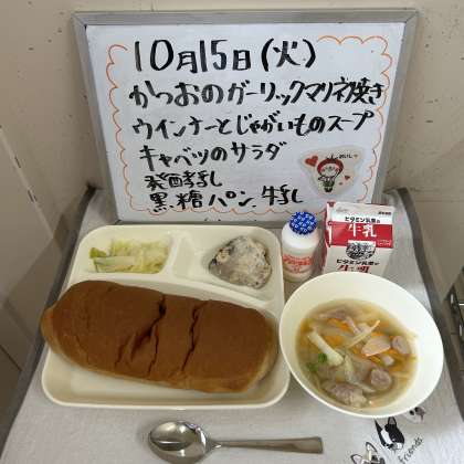 今日の給食の献立は、『かつおのガーリックマリネ焼き、ウインナーとじゃがいものスープ、キャベツのサラダ、発酵乳、黒糖パン、牛乳』でした。