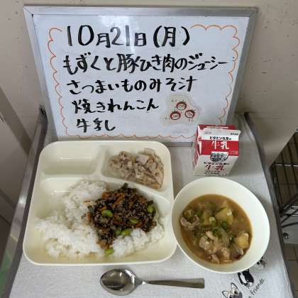 今日の給食の献立は、『もずくと豚ひき肉のジューシー、さつまいものみそ汁、焼きれんこん、牛乳』でした。