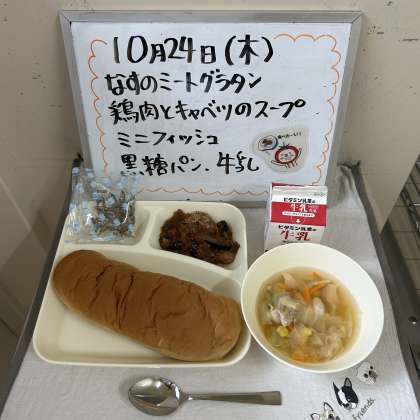 今日の給食の献立は、『なすのミートグラタン、鶏肉とキャベツのスープ、ミニフィッシュ、黒糖パン、牛乳』でした。
