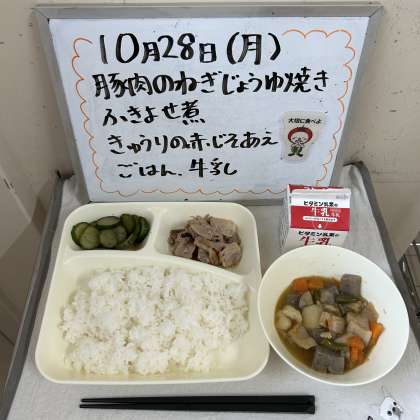 今日の給食の献立は、『豚肉のねぎじょうゆ焼き、ふきよせ煮、きゅうりの赤じそあえ、ごはん、牛乳』でした。