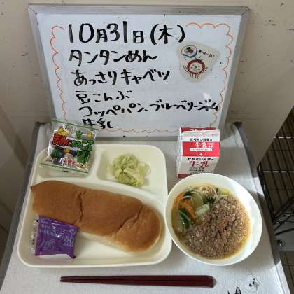 今日の給食の献立は、『タンタンめん、あっさりキャベツ、豆こんぶ、コッペパン、ブルーベリージャム、牛乳』でした。