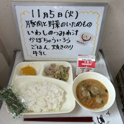 今日の給食の献立は、『豚肉と野菜のいためもの、いわしのつみれ汁、かぼちゃういろう、焼きのり、ごはん、牛乳』でした。