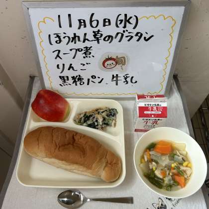 今日の給食の献立は、『ほうれん草のグラタン、スープ煮、りんご、黒糖パン、牛乳』でした。