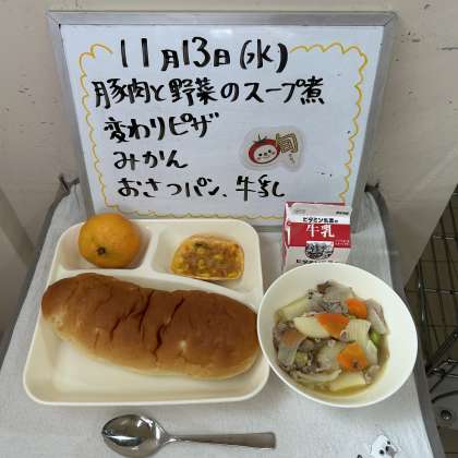 今日の給食の献立は、『豚肉と野菜のスープ煮、変わりピザ、みかん、おさつパン、牛乳』でした。