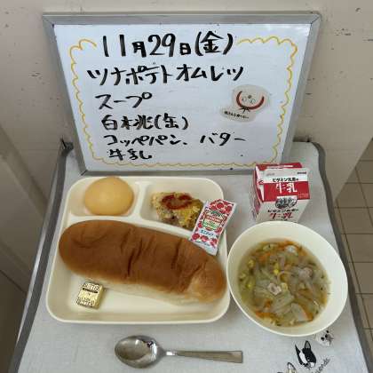 今日の給食の献立は、『ツナポテトオムレツ、スープ、白桃(缶)、コッペパン、バター、牛乳』でした。