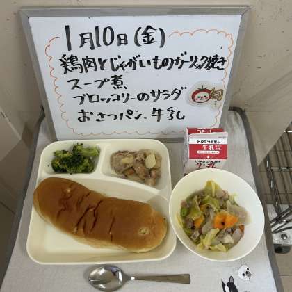 今日の給食の献立は、『鶏肉とじゃがいものガーリック焼き、スープ煮、ブロッコリーのサラダ、おさつパン、牛乳』でした。