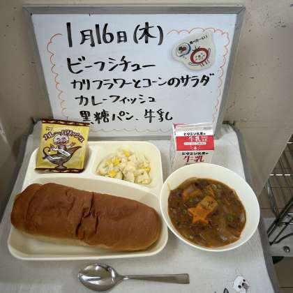 今日の給食の献立は『ビーフシチュー、カリフラワーとコーンのサラダ、カレーフィッシュ、黒糖パン、牛乳』でした。