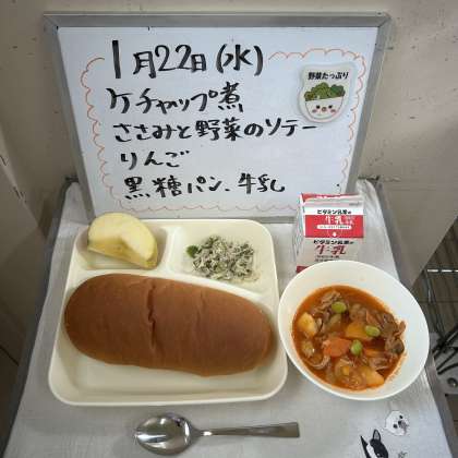 今日の給食の献立は『ケチャップ煮、ささみと野菜のソテー、りんご、黒糖パン、牛乳』でした。