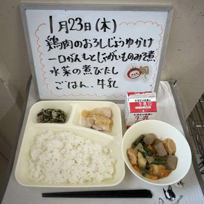 今日の給食の献立は『鶏肉のおろしじょうゆかけ、一口がんもとじゃがいものみそ煮、水菜の煮びたし、ごはん、牛乳』でした。