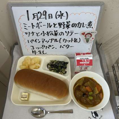 今日の給食の献立は『ミートボールと野菜のカレー煮、ツナと小松菜のソテー、パインアップル(カット缶)、コッペパン、バター、牛乳』でした。