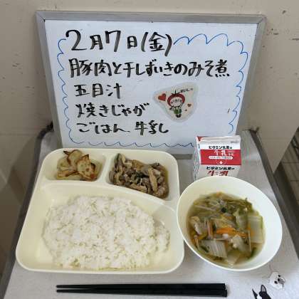 今日の給食の献立は『豚肉と干しずいきのみそ煮、五目汁、焼きじゃが、ごはん、牛乳』でした。