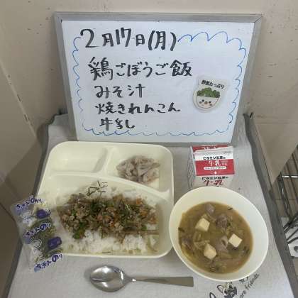 今日の給食の献立は『鶏ごぼうごはん、みそ汁、焼きれんこん、牛乳』でした。