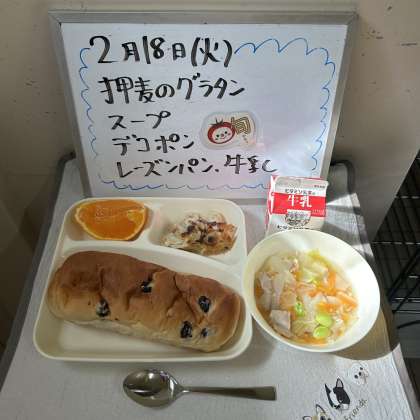 今日の給食の献立は『押麦のグラタン、スープ、デコポン、レーズンパン、牛乳』でした。