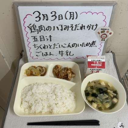 今日の給食の献立は『鶏肉の八丁みそだれかけ、五目汁、ちくわとだいこんのいため煮、ごはん、牛乳』でした。