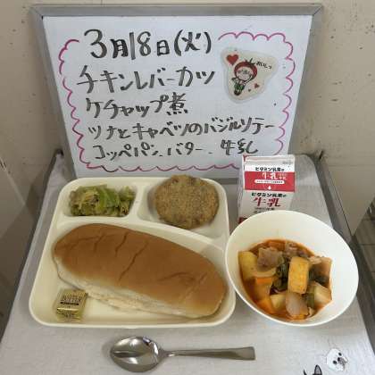 今日の給食の献立は『チキンレバーカツ、ケチャップ煮、ツナとキャベツのバジルソテー、コッペパン、バター、牛乳』でした。