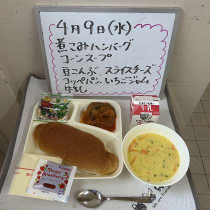 今日の給食の献立は『煮こみハンバーグ、コーンスープ、豆こんぶ、スライスチーズ、コッペパン、いちごジャム、牛乳』でした。