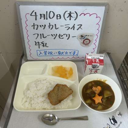 今日の給食は、入学祝い献立で『カツカレーライス、フルーツゼリー、牛乳』でした。