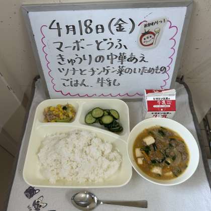 今日の給食の献立は『マーボーどうふ、きゅうりの中華あえ、ツナとチンゲン菜のいためもの、ごはん、牛乳』でした。